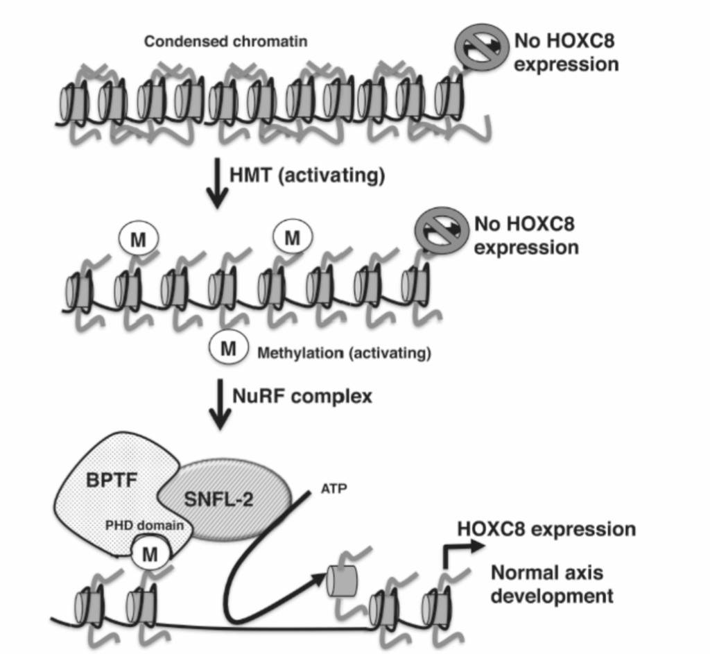 図 1.20-5. ヒストンメチル化は、そのPHDドメインを介してBPTFをリクルートし、NuRF複合体の一部としてクロマチンリモデリング酵素SNFL2を連れてきます。SNFL2の結合により、プロモーターからATP依存的にヌクレオソームが除去され、HOXC8の発現と脊椎動物の正常な軸発達が起こります。