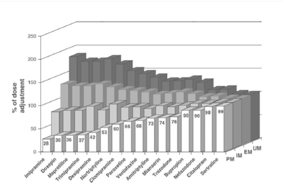 CYP2D6がより活性であるほど、この酵素によって代謝される薬剤はより速く除去されます。したがって、標準用量ではUMにとって不十分な場合があり、より高用量が必要となります。CYP2D6 UMは、単に標準用量が低すぎるために、精神科の薬剤に反応しない場合があります。その場合、彼らにとって優れた薬剤である可能性があるにもかかわらず、適切な用量を受けていないのに、不適切に非反応者とレッテルを貼られてしまいます。逆に、劣代謝者と中間代謝者は、標準的なCYP2D6機能を持つ人よりも処方薬をより遅く分解します。少なくとも15種類のCYP2D6のアレルバリアントがPM表現型を引き起こす可能性がありますが、PMの75%はCYP2D6*4ホモ接合体です。したがって、彼らは標準用量を服用することで、生物活性を持つ薬剤を蓄積し、重篤な副作用を急速に引き起こす可能性があります。患者は、実際には代謝能力をはるかに超える用量で与えられた薬剤に対して不耐性であると誤ってレッテルを貼られてしまいます。この場合、遅い代謝を相殺するために用量を下げる必要があり、個人に合わせた用量で良好に反応する可能性があります。