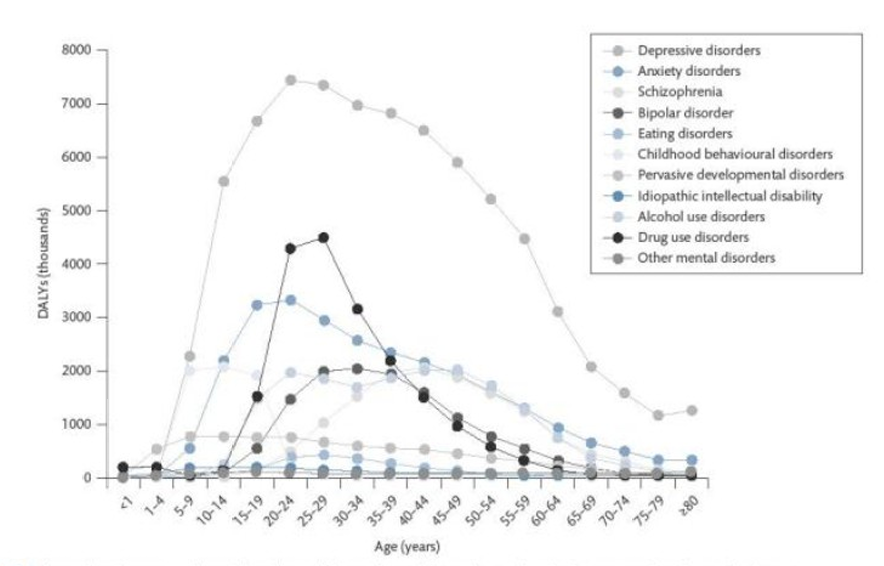 図 3.1(カラープレートセクション参照)2010年における各精神・物質使用障害の年齢別障害調整生活年(DALYs)。