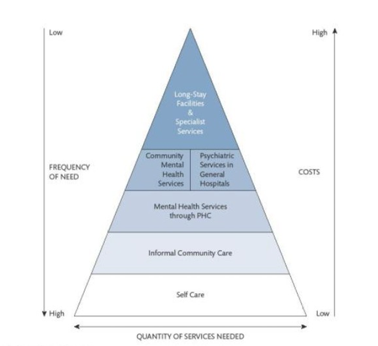 メンタルヘルスサービスの提供に関しては、WHOは最適なサービスミックスを推奨しており、これはピラミッドで描くことができます(図 3.2)[46]。これは、セルフケアの促進、プライマリケアとコミュニティベースのサービスの開発、メンタルヘルスを一般の医療サービスに統合すること、および少数の専門的なメンタルヘルスサービスの提供を強調しています。この全体的な枠組みの中で、Disease Control Prioritiesイニシアティブは、メンタルヘルスの促進と予防、治療、およびリハビリテーションを対象とした、サービスプラットフォームを通じて提供される最も費用対効果の高い介入の詳細なレビューを提供しています[47]。