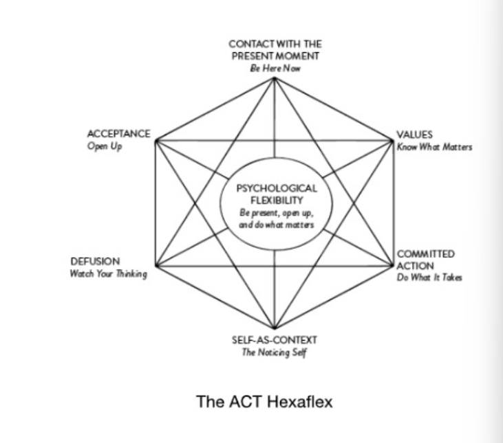 機能的文脈主義として知られる科学哲学と、関係フレーム理論として知られる言語の理論に基づいて、ACTモデルは、下の図に示される六つの核となるプロセスに基づいています。(これはしばしば面白半分に「ヘキサフレックス」と呼ばれます。)