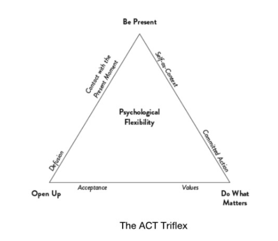 ACTは、価値とマインドフルネスのスキルを創造的に使用して、人々が心理的な苦痛を減らし、意味のある人生を築くのを助ける一種の認知行動療法です。これは、心理的柔軟性を発達させることによって達成されます。つまり、私たちがしていることに集中し関与する能力、私たちの認知や感情をそのまま認め許容する能力、そして私たちの価値観に導かれて効果的に行動する能力です。言い換えれば、「存在する、心を開く、大切なことをする」です。