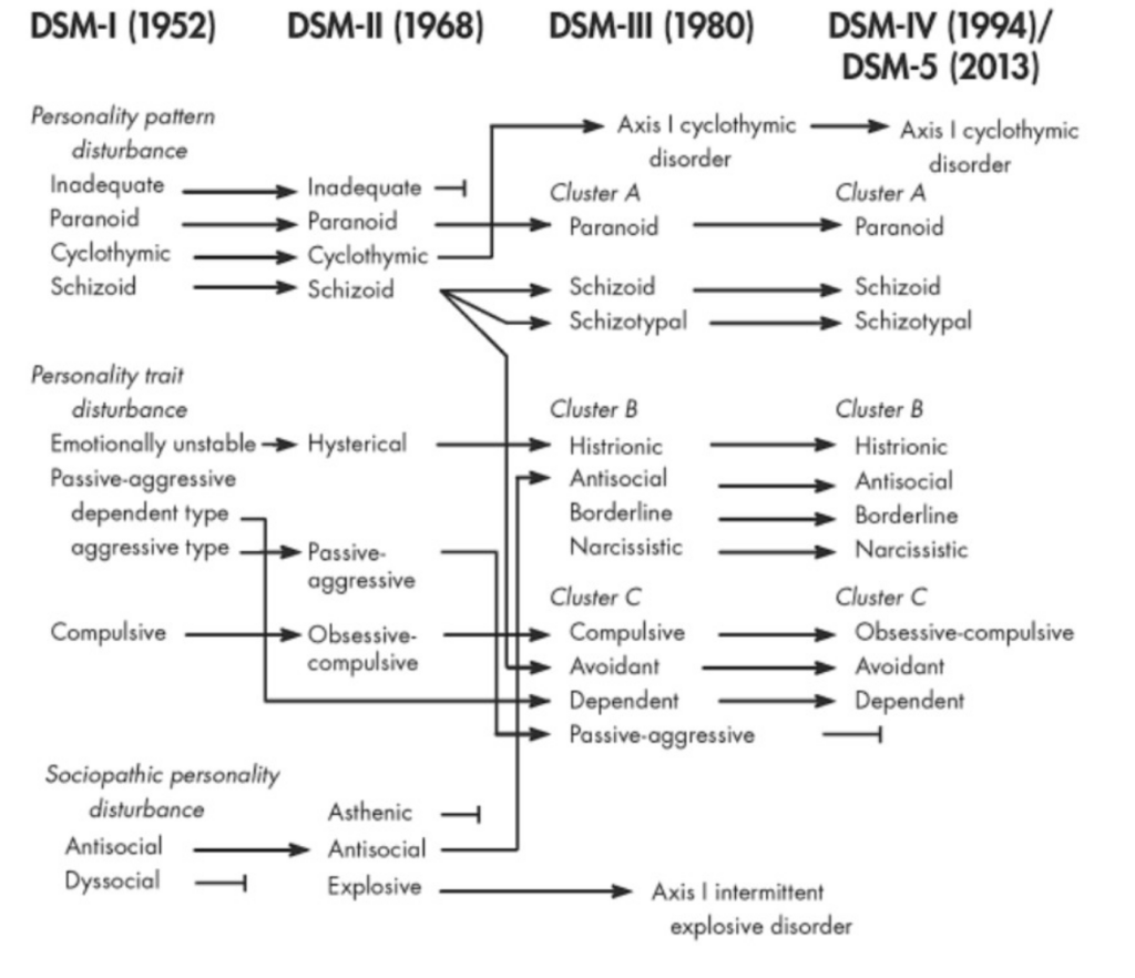 一般的に遭遇する仮定に反して、パーソナリティ障害は、APAの『精神疾患の診断・統計マニュアル(DSM)』の初版からすべての版に含まれてきた。第二次世界大戦の文脈において標準化された精神科診断の必要性に迫られ、米国国防省は1943年に「テクニカル・ブレティン(技術公報)203」という文書を作成した。これは、ストレスによって引き起こされる精神疾患を分類するための、精神分析に基づいた用語体系を提示したものである(Barton 1987)。APAは命名法・統計委員会に対し、専門家の意見を募り、精神科診断を体系化・標準化する診断マニュアルの開発を依頼した。この診断体系が、DSMの初版(American Psychiatric Association 1952)の枠組みとなった。このマニュアルはその後、数回にわたり改訂され、新版が登場した。DSM-II (1968)、DSM-III (1980)、DSM-III-R (1987)、DSM-IV (1994)、DSM-IV-TR (2000)、そしてDSM-5 (2013) である。