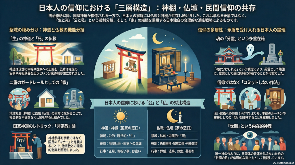 一般の民衆が「仏壇と神棚」の併存をどのように納得し、受け入れていたのか。それは現代のような「宗教(ドグマ)」の選択という感覚ではなく、より生活に密着した「役割分担(棲み分け)」と「家の存続」という極めて実利的な論理によるものでした。