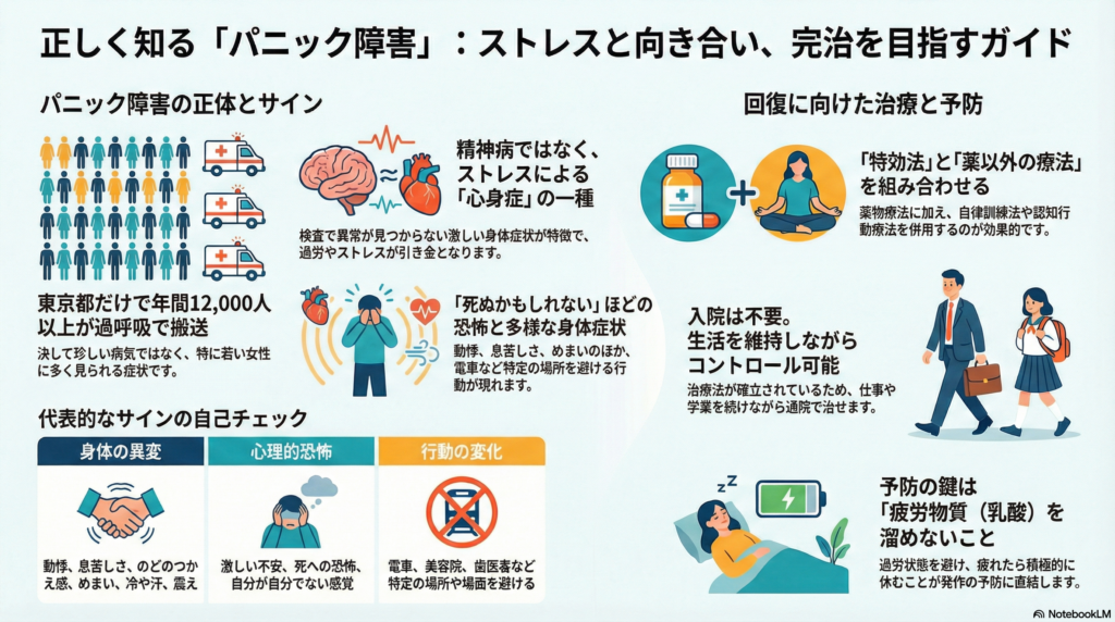 心臓がどきどきする。呼吸が苦しい。 息がしにくい。 のどに何かつまったような感じがする。 めまいや鳴り、ふらつきがひどい。冷や汗が出る。 手足やからだ全体がふるえる。しびれる。 一般内科などで身体の検査をしてもはっきりした理由が見つからない。 死ぬのではないかと思うほどの恐怖。 自分が自分でない感じ。激しい不安。 特定の場所・場面が苦手になる。 例えば、電車、美容院、歯医者などが代表的。