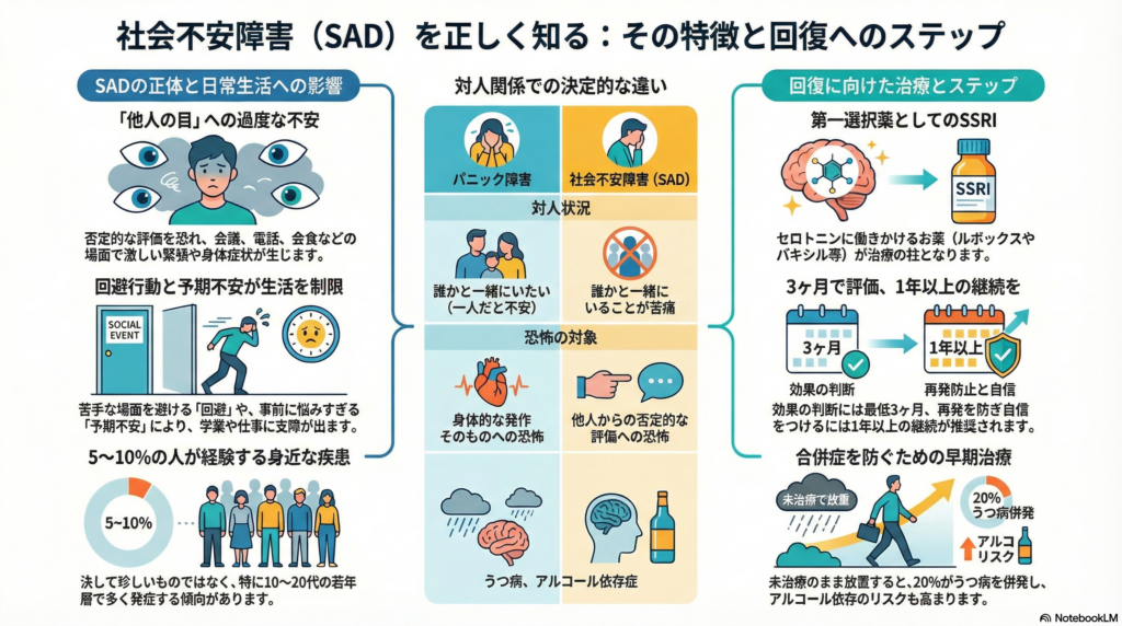 最近、耳にすることが多くなった「社会不安障害(SAD:Social Anxiety Disorder)」。かつて日本で「対人恐怖症」と呼ばれていたものに近い概念ですが、現代の医学ではより明確に定義されています。