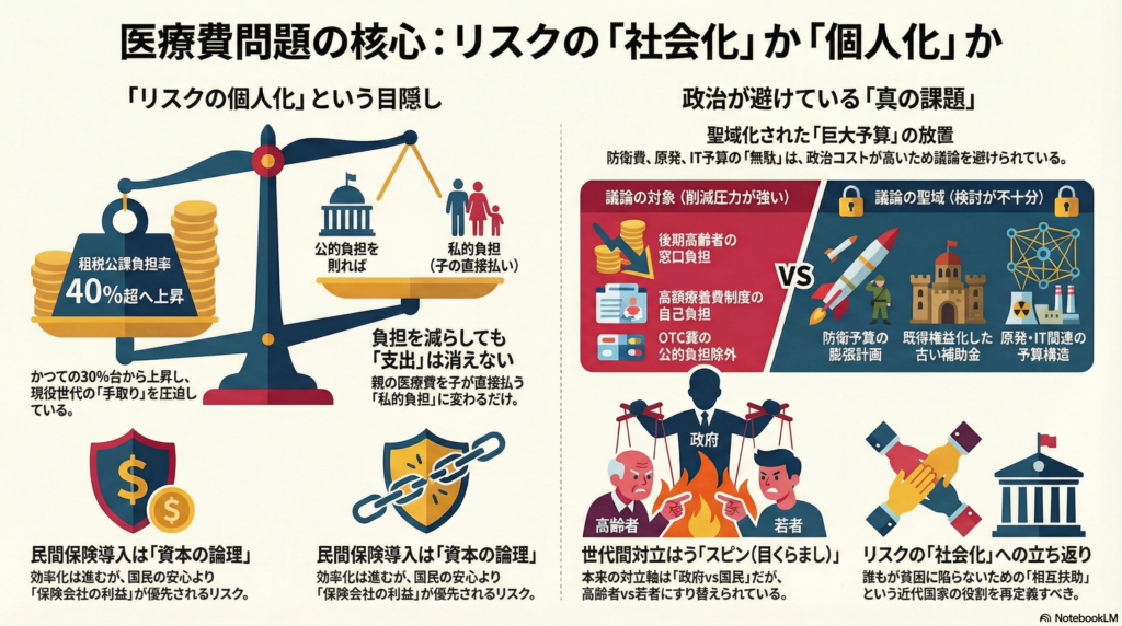 バラバラに語られがちな「現役世代の痛税感」「高齢者医療費」「防衛費」「新産業の不在」といった要素を、「リスクの社会化か、個人化か」という価値判断の軸で一本に繋ぎます。