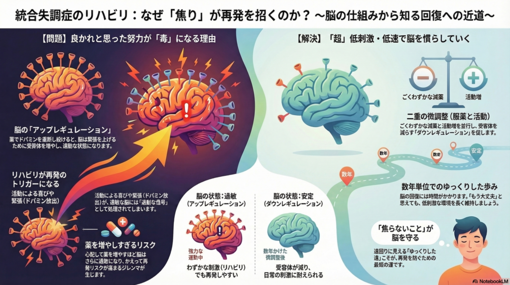 薬量を増やせば一時的にドパミン信号は遮断されるが、脳はさらに過敏状態を強め、次なる刺激やわずかな飲み忘れに対してより脆弱になる 。この悪循環を断つためには、再発のリスクを最小限に抑えつつも、**「受容体を減らすために、薬を少しずつ減らし、活動を少しずつ増やす」**という、双方向からの精密なコントロールが求められる
