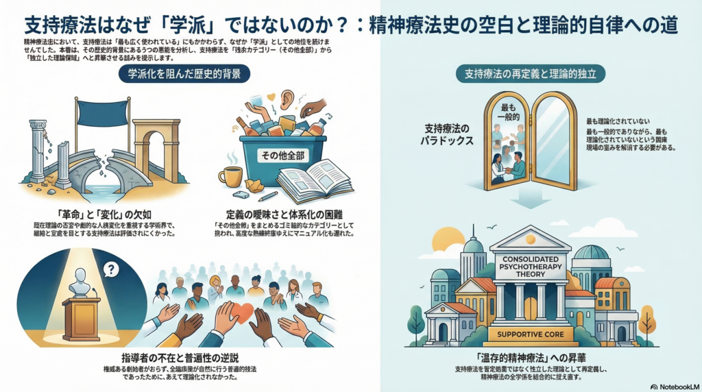 崩れそうな心に寄り添い、日々の生活を維持する――。この「支持療法」と呼ばれるアプローチは、臨床において不可欠な「空気」のような存在です。しかし不思議なことに、精神分析や認知行動療法(CBT)のような強力なアイデンティティを持つ「学派」として独立することはありませんでした。