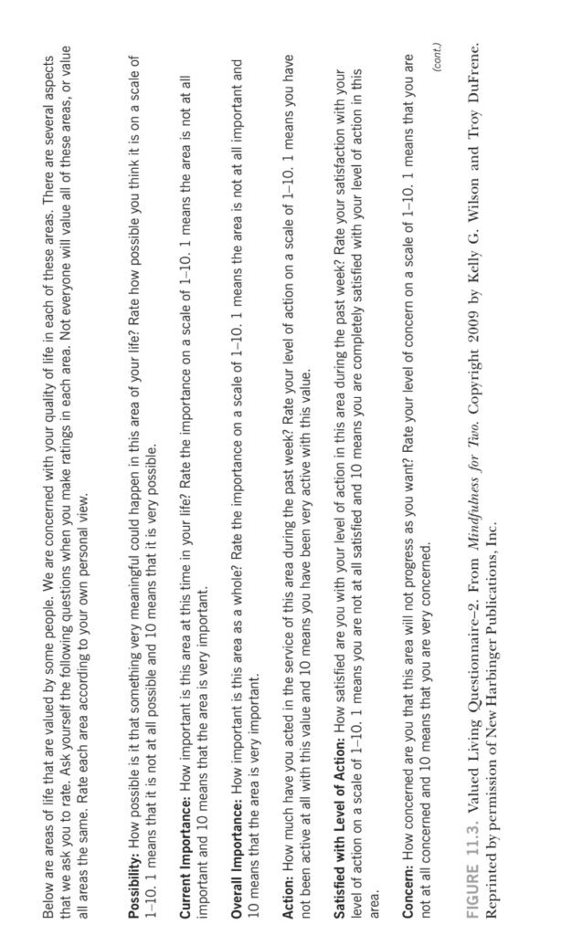 - ナラティブが完成したら、クライアントは「価値ある生活アンケート-2」(VLQ-2;Wilson et al., 2010)(図11.3に示す)に評定を記入することによって評価を行う。(後に同様の評定を行うことは、一種の練習として臨床家にも有益でありうる。)二組の評定(クライアントとセラピスト)の目的は、臨床家とクライアントがうまく意思疎通できていない領域を特定する助けをすることにあり、それは議論を通じてさらなる明確化が必要かもしれない領域についての指針を提供する。