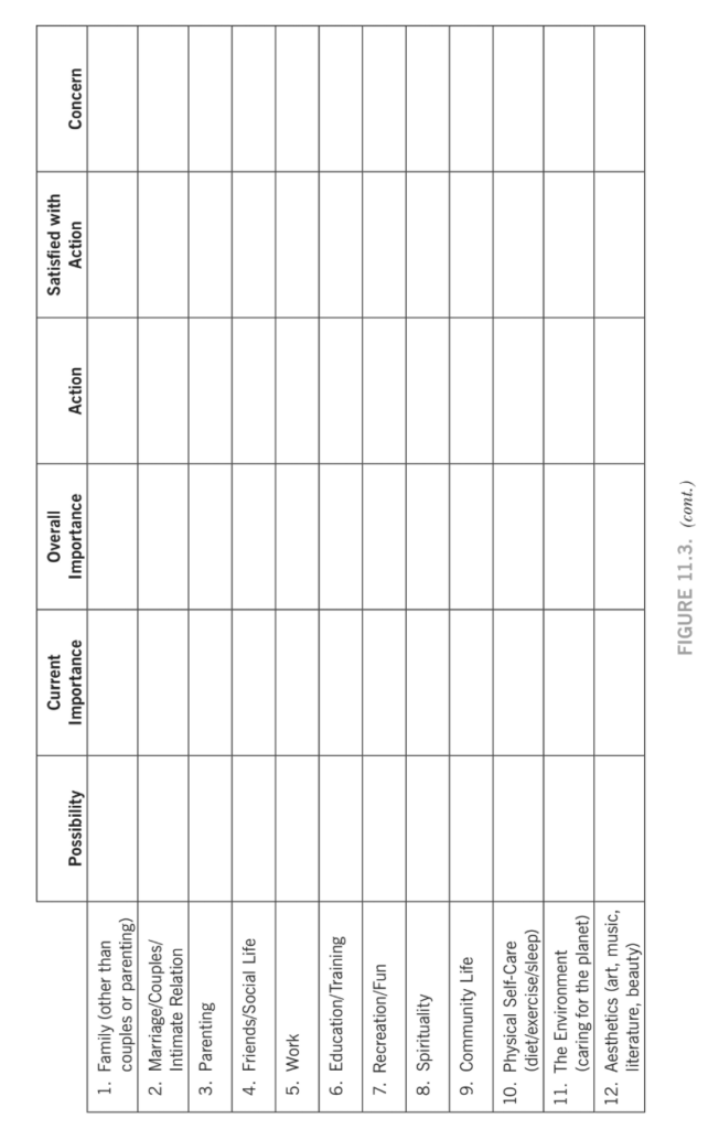 特定の領域において、価値ある目標がない場合もあるかもしれない。それらの領域は飛ばして、セラピストと直接話し合うことができる。また、自分の前に障害が何もなかった場合に大切にするだろうことを書き留めることも重要である。現実的に得られると思うものや、自分または他者が自分にふさわしいと思うものを尋ねているのではない。最善の状況において、自分が何を大切にしているか、何に向けて取り組みたいかを知りたいのである。ワークシートに取り組む間、魔法が起きて何でも可能だと仮定すること。