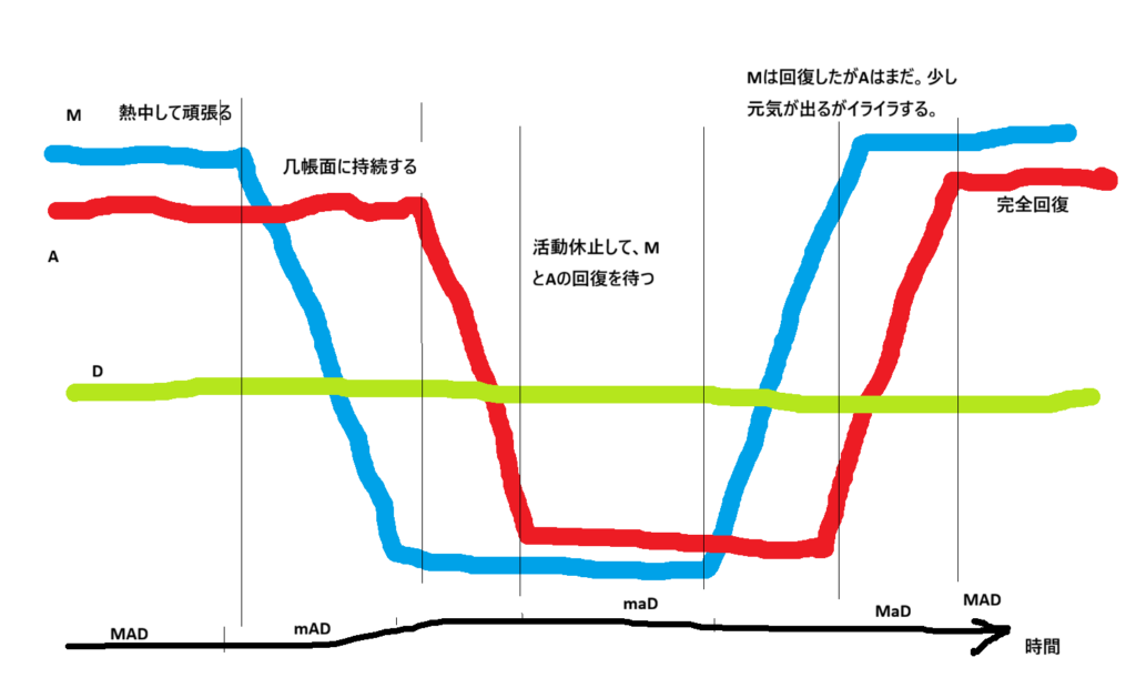 Mのラインは、真ん中がへこんだカーブ。 Aのラインは、真ん中がへこんでいるが、Mよりも時間が遅れたカーブ。 Dのラインは、時間によらず一定。