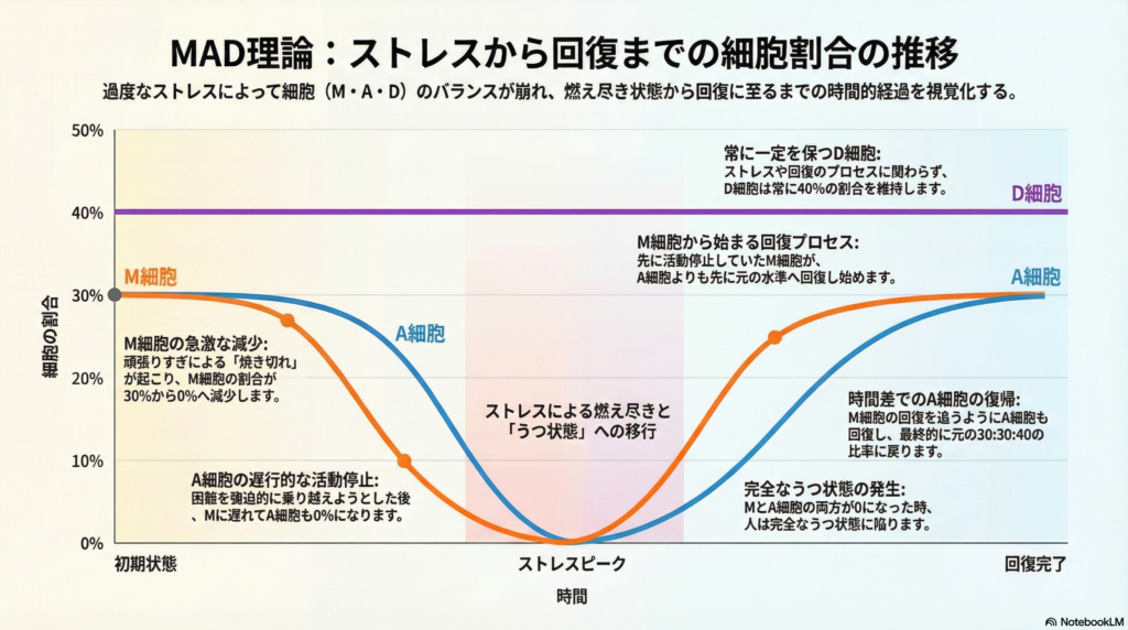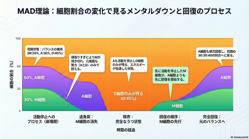 - 対策: 回復は「M細胞 → A細胞」の順で起こります。先に活動停止したM細胞が先に回復を始めるため、まずはエネルギーが少しずつ戻り、その後に几帳面さや責任感といった機能が戻って元の割合へと至ります。この順序を知っておくことで、焦らずに回復を待つという精神的な対策になります。