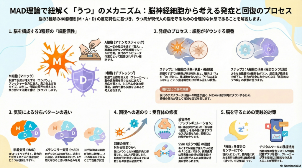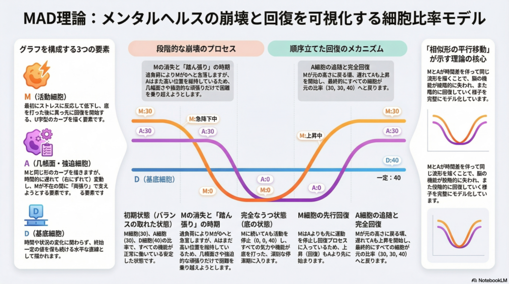 M細胞が消失した(M=0)段階で、人は残されたA細胞を使い、**「几帳面で強迫的な頑張り」**によって困難を乗り越えようとします。しかし、この無理を続けるとA細胞までもが活動を停止し、完全な「うつ状態(M=0, A=0)」に陥ってしまいます。