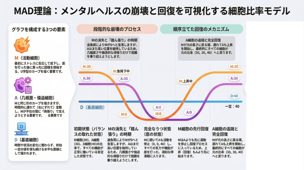 M細胞が消失した(M=0)段階で、人は残されたA細胞を使い、**「几帳面で強迫的な頑張り」**によって困難を乗り越えようとします。しかし、この無理を続けるとA細胞までもが活動を停止し、完全な「うつ状態(M=0, A=0)」に陥ってしまいます。