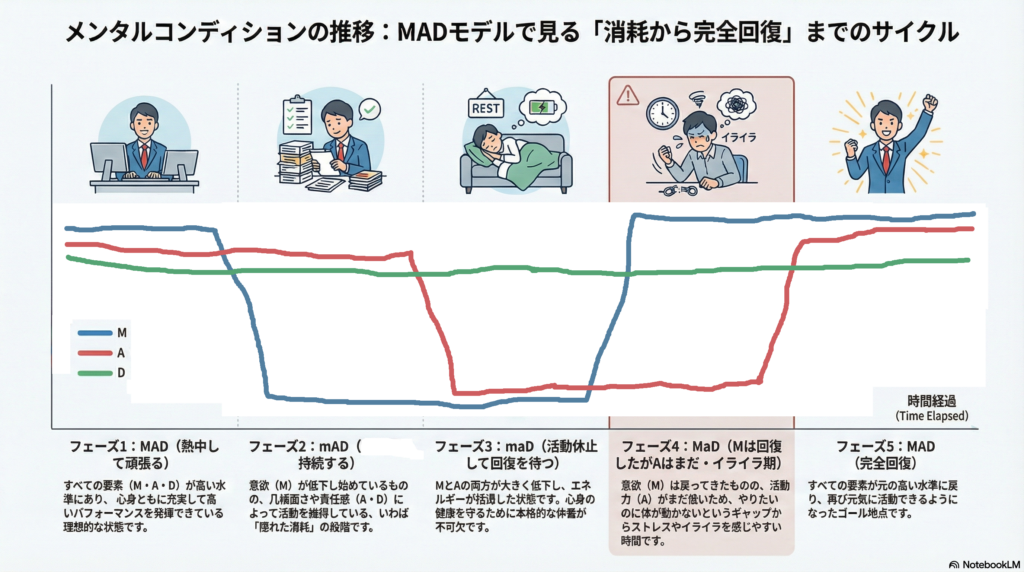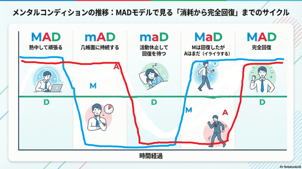 - 対策: **「以前のような意欲(M)が出ないのに、責任感や几帳面さ(A)だけで何とかこなしている」**と感じる時が、最後のアラートです。この時点で「これ以上几帳面に頑張るのをやめる」ことが、完全なうつ状態への進行を防ぐ鍵となります。