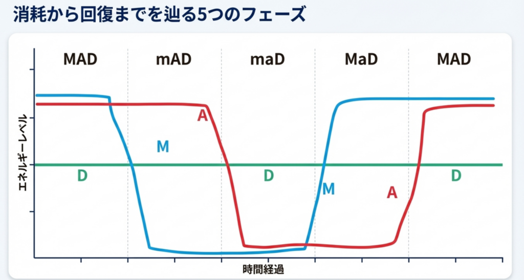 - 対策: 回復は「M細胞 → A細胞」の順で起こります。先に活動停止したM細胞が先に回復を始めるため、まずはエネルギーが少しずつ戻り、その後に几帳面さや責任感といった機能が戻って元の割合へと至ります。この順序を知っておくことで、焦らずに回復を待つという精神的な対策になります。